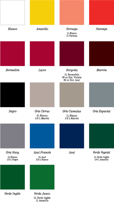 | Secado | Al tacto 3 hrs. Repintado 10 hrs. |
